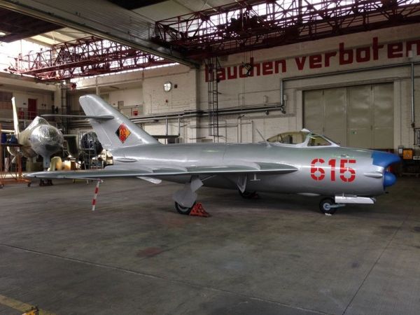 Die hier ausgestellte Maschine wurde 1959 in das 9. Fliegergeschwader der 3. Fliegerdivision der NVA in Drewitz eingeführt (der Verband verlegte nach Peenemünde und hieß ab 1961 "9. Jagdfliegergeschwader", ab 1966: "Jagdgeschwader 9 ’Heinrich Rau’").