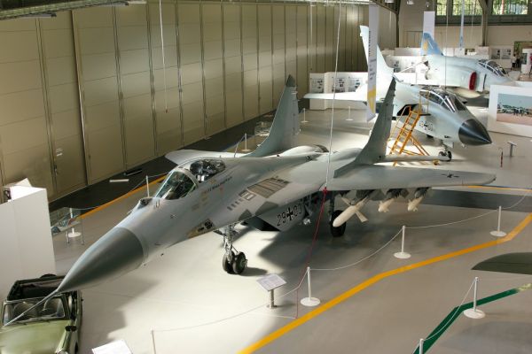 Die MiG-29 ist ein Abfangjäger, der am Ende des Kalten Krieges von der Sowjetunion als Gegenstück zur amerikanischen F-16 produziert wurde. Nach der deutschen Wiedervereinigung war es das einzige Kampfflugzeug der Nationalen Volksarmee der DDR, das langfristig durch die Luftwaffe der Bundeswehr übernommen wurde. Die 24 Maschinen wurden zunächst im Erprobungsgeschwader MiG-29 (Preschen) getestet und ab 1994 durch das Jagdgeschwader 73 "Steinhoff" in Rostock-Laage geflogen. Die Maschinen dienten als Alarmrotten beim Air-Policing und als Übungsgegner für NATO-Partner. 2003/2004 wurden 22 der mittlerweile nach NATO-Standards umgerüsteten Flugzeuge an Polen übergeben. Eine Maschine (29+09) ist am 25.06.1996 bei einem Flugunfall verloren gegangen. Die hier ausgestellte Maschine mit der Kennung 29+03 (NVA-Kennung 615) wurde im Jahr 2004 im JG 73 außer Dienst gestellt und nach einer Phase der Ersatzteilgewinnung 2006 an das Luftwaffenmuseum in Berlin-Gatow übergeben. Alle nach Polen zu überführenden Maschinen erhielten den Namenszug ihres letzten deutschen Piloten - anders als in den USA ein in Deutschland unübliches Verfahren. Am Cockpit dieser Maschine haben Soldaten des Geschwaders den Namenszug "OTL Michael ‚Micha’ Wegerich" angebracht. Oberstleutnant Wegerich ist ein ehemaliger NVA-Pilot, der in die Bundeswehr übernommen wurde und bis 1993 unter anderem diese Maschine flog.